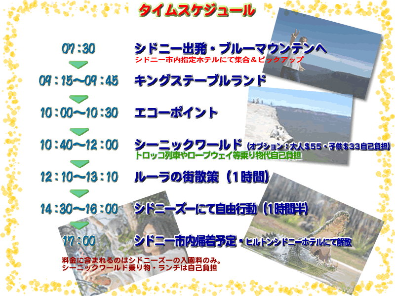 ・・シドニー市内指定ホテル集合&ピックアップ・日本語ガイド・自然動物園入園料・キングスーテーブル・エコーポイント